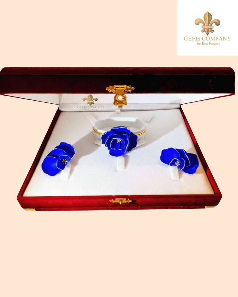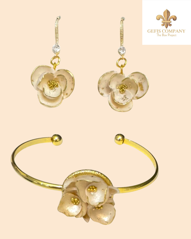Handmade bracelet and earring set of white flowers and gold details or handmade bracelet and earring set in dark blue with gold details inspired by the depths of the ocean and the shades of sunlight in the vast blue of the sea. The jewelry can also be purchased individually.